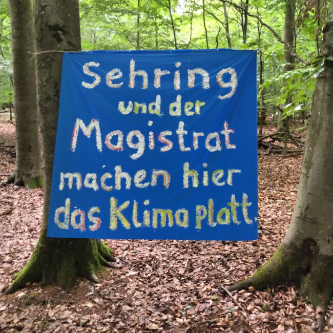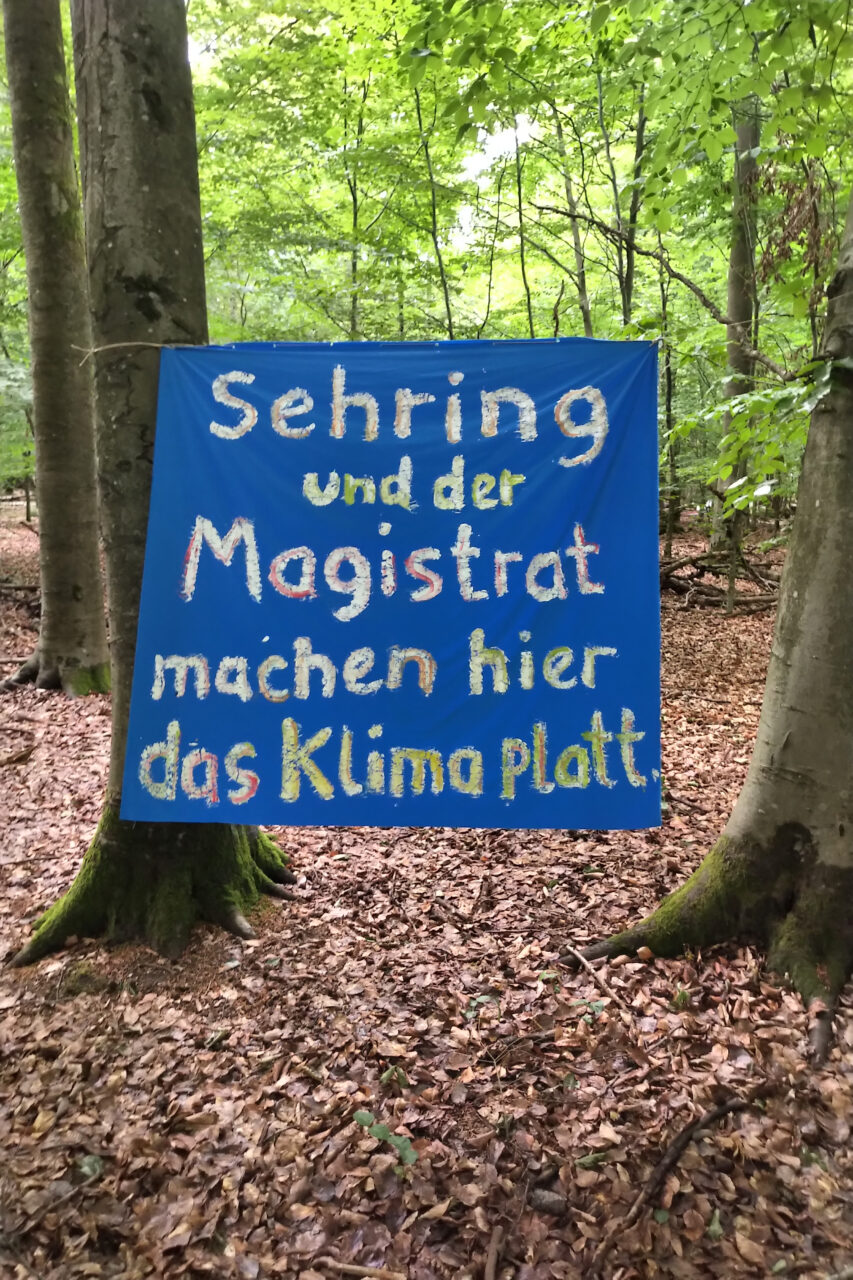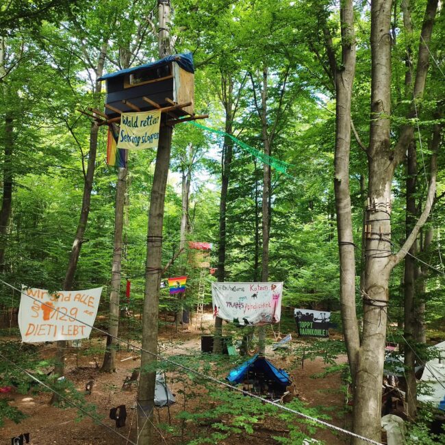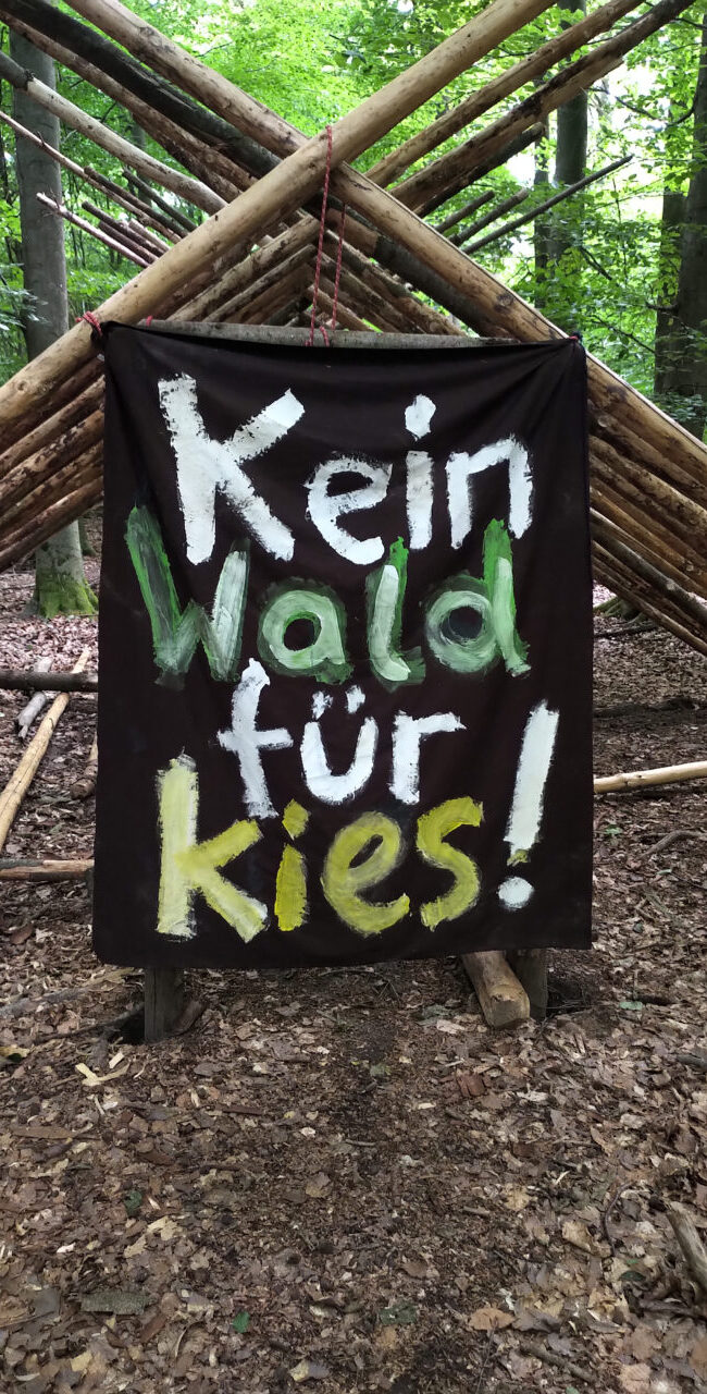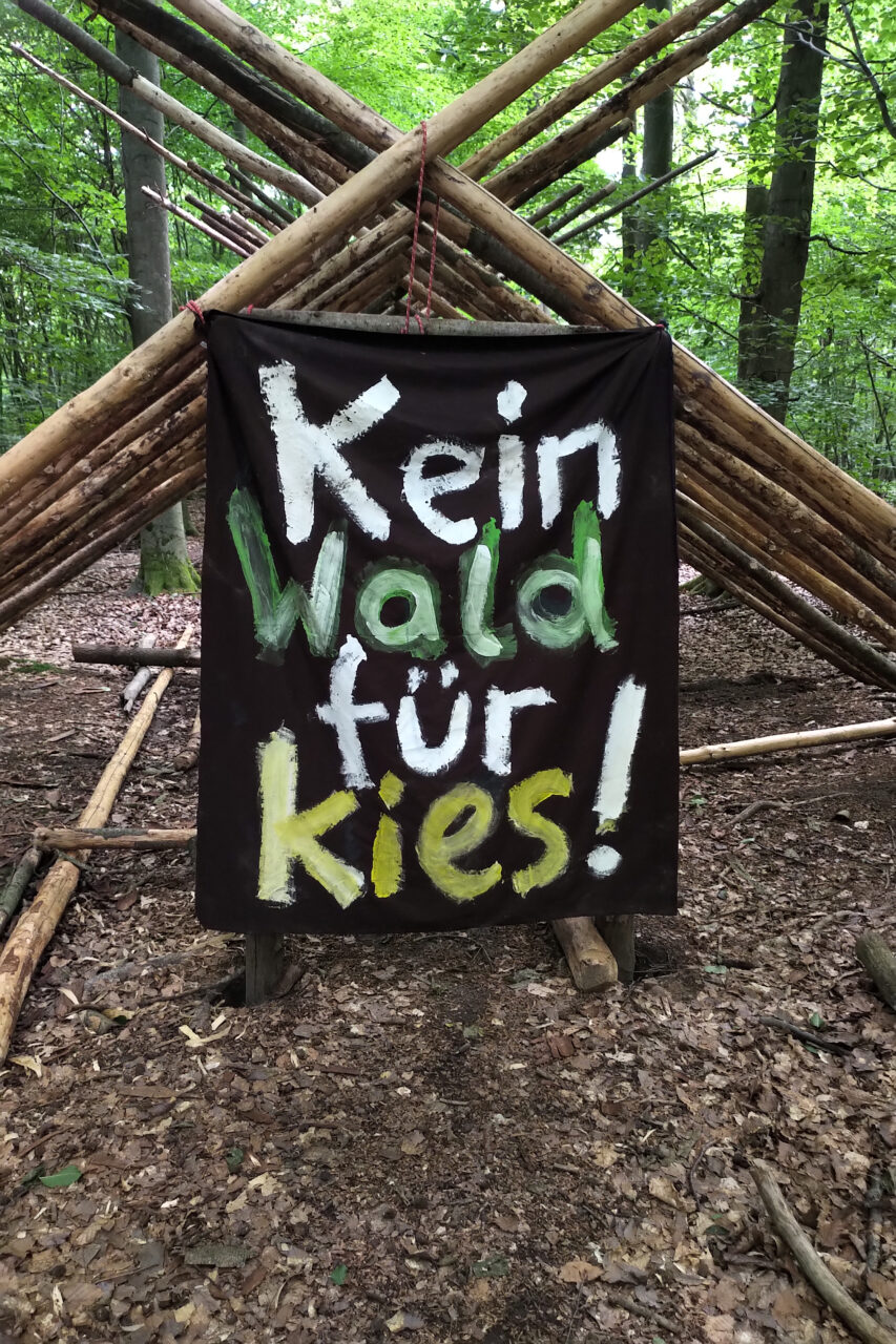 Am dritten Juli-Wochenende 2024 wurde ein Teil des Bannwaldes, welcher für die Erweiterung der Kiesgrube gerodet werden soll von Aktivist:innen besetzt. Mehr dazu in der Pressemitteilung: Jetzt langt’s! Langener Bannwald besetzt.