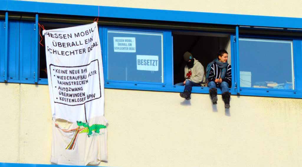 Am Montag Morgen, den 09.02.2026, besetzten einige Aktivist*innen der Gruppe “Krokodil gegen Hessen Mobil” die BĂŒros der Hessen Mobil Außenstelle in Schotten. Diese ist zustĂ€ndig fĂŒr die Planung und Umsetzung der umstrittenen B49 zwischen Lindenstruth und Reiskirchen.