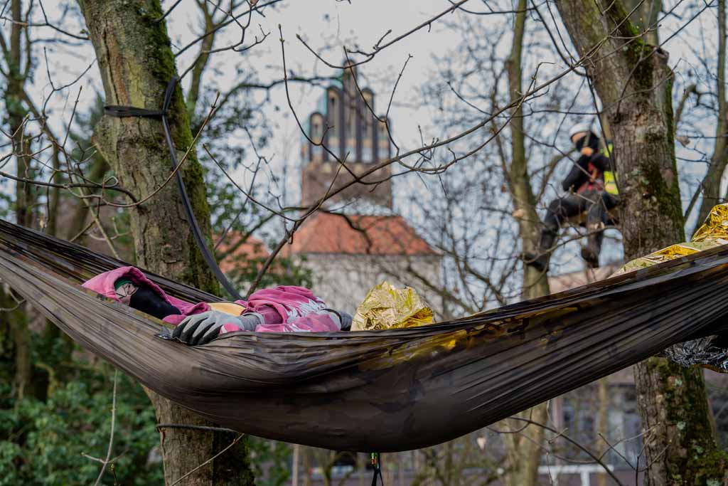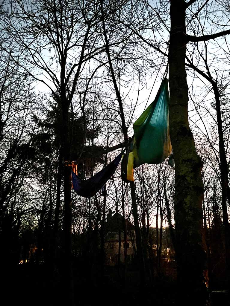 Auch wenn es lĂ€ngst kein Geheimnis mehr ist, dass der Stadt Darmstadt die finanziellen Mittel fĂŒr das schlecht geplante Bauprojekt fehlen, sollten nun Fakten geschaffen werden. Doch als die, mit der Rodung beauftragte Firma mit mehreren Fahrzeugen und Lastwagen anrĂŒckte erlebte sie eine Ăberraschung: Die Aktivist*innen hatten nicht nur sĂ€mtliche ZugĂ€nge zum Areal verbarrikadiert – mit Schaukeln und HĂ€ngematten machten sie es sich in genau den BĂ€umen bequem, die fĂŒr die FĂ€llung vorgesehen waren. Den Arbeiter*innen blieb nichts anderes ĂŒbrig als unverrichteter Dinge wieder abzuziehen.