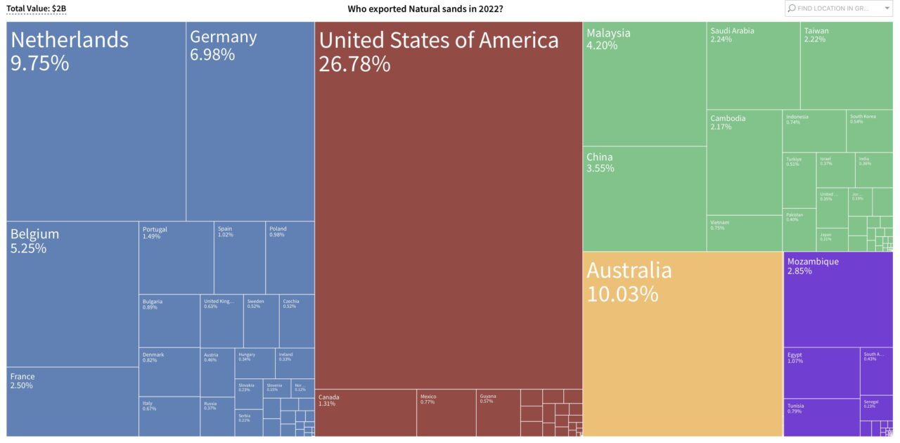 Der Fall Langen steht stellvertretend fĂŒr ein Problem, das allgemein in der öffentlichen Debatte bislang weniger Aufmerksamkeit erhĂ€lt: Sand und Kies gehören zu den meistgeförderten Rohstoffen der Welt und Deutschland gehört mit den USA, Australien, und den Niederlanden zu den Hauptproduzenten und -exporteuren (Harvard Atlas of Economic Complexity, 2025).